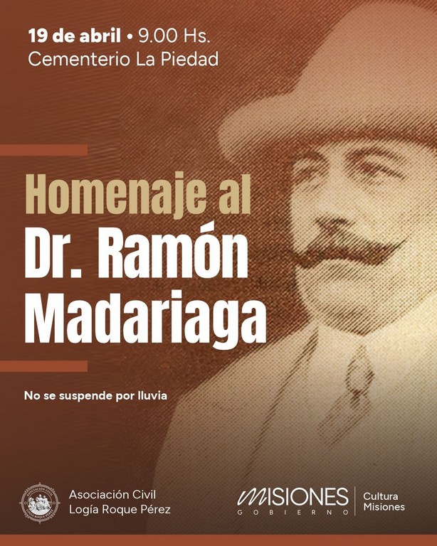 A 114 años del fallecimiento del Dr. Juan Ramón Madariaga, este sábado 19 de abril se llevó a cabo un emotivo homenaje en su mausoleo, ubicado en el cementerio La Piedad de Posadas. El acto fue organizado por la Asociación Civil Logia Roque Pérez, junto a la Secretaría de Cultura de la provincia y contó con la declaración de interés por parte de la Cámara de Representantes de Misiones.